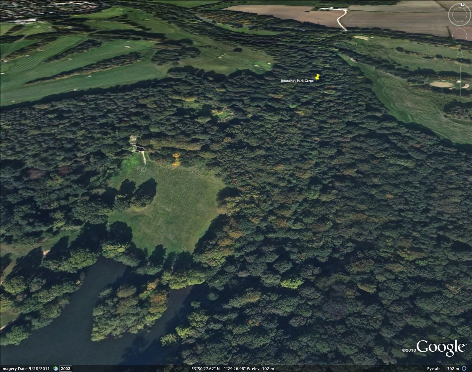 Remembering my old running, cycling, tree-climbing haunt of Roundhay Park (North Leeds) today I thought I'd show some pictures related to the geology of the place. Firstly here's a GoogleEarth view of the northern end of Waterloo Lake, with "The Folly" at the top of the grassy slope and "The Gorge" snaking away beneath the sea of trees.